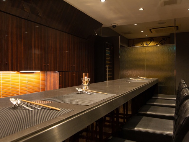 점내는 세련되고 고급스러운 공간입니다. 좌석은 카운터석 외에 4명부터 20명까지 이용할 수 있는 4개의 개인실도 완비되어 있습니다. 이곳에서는 개인실도 철판이 달린 카운터석이므로 눈앞에서 요리사가 요리하는 모습을 볼 수 있습니다. 소믈리에가 엄선한 와인은 프랑스산을 중심으로 세계 각국의 70종류 이상의 종목이 갖추어져 있습니다.